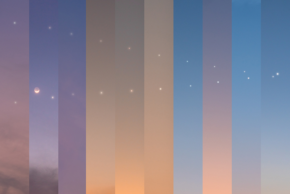 最近你可能有在關注金星和木星的行蹤。這兩顆清朗夜空中最明亮的行星即將發生近合,帶來難以錯過的景觀。這些在二月二十一日到三月二日之間攝於印度.丹巴德市的圖板,逐日記錄了金星與木星(上)的進程。圖板聚焦西方地平線附近的天空,而每個圖板所記錄傍晚天空色彩及曝光長度,則取決於日落時份的當地條件。