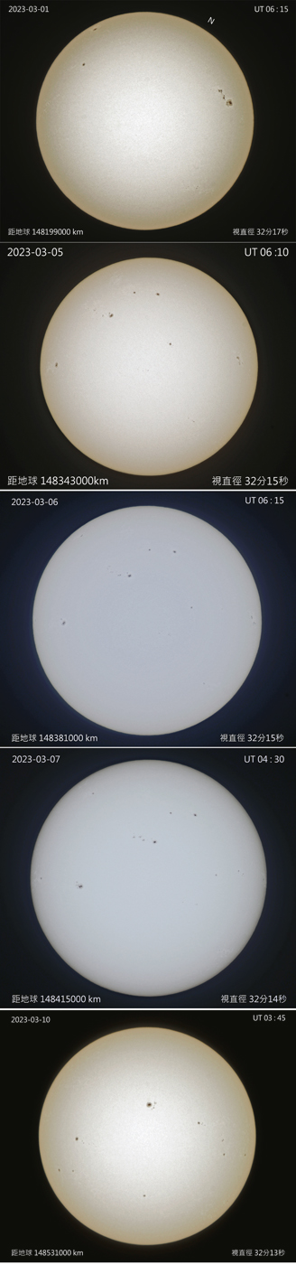若然太陽表面沒有黑子活動的話,要知道太陽自轉便沒有那麼容易了,也不可下子定出太陽的南北極呢。三月天氣只有上旬比較多晴天,但仍受到煙霞困擾,使太陽觀測都受到一定程度的影響,只能作光球層上的黑子紀錄,而不利於色球層的觀測。基本上近來的黑子活動都屬於活動周期中的正常狀況,唯色球層則相對比較活躍,日珥和耀斑間中都出現較強烈的活動,幸好沒有對地球太大影響,只是出現極光現象呢。(李志輝)