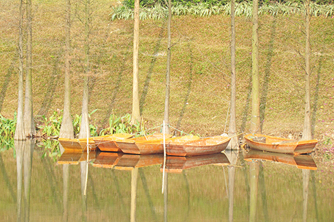 水景是麓湖公園的特色,深冬時節的湖岸披上落羽杉那棗紅色外衣,遠遠望去特別壯麗。加上冬春水靜,岸邊小船泊而不動,一幅靜態美景如油畫般展現在眼前。