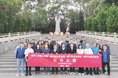 【特訊】澳門工會聯合總會、澳門漁民互助會、澳門菜農合群社、澳門巿販互助會於日前合辦(三月二十四日至二十六日)以「感受紅色基因、緬懷革命先烈」為主題的「紅色之旅」活動,一行三十多人前往惠州巿惠東高潭鎮及中洞村。於高潭老蘇區瞻仰革命烈士紀念碑,向革命先烈敬獻花圈。