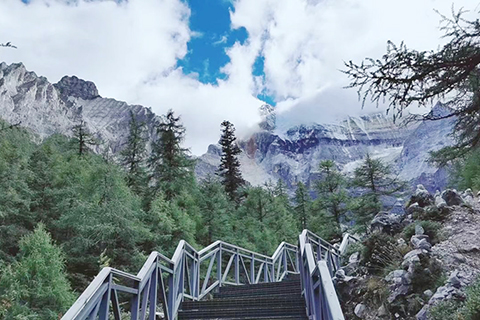 由於時間接近下午三點,上山的遊客明顯減少,坐在等待客滿才上山的旅遊大巴上,我們心急如焚。亞丁自然保護區是分長線和短線徒步的,長線主要走牛奶海和五色海,徒步往返10公里,大約需要五六個小時;短線由沖古寺徒步一個小時就到珍珠海,往返3公里,約需要兩個半小時。如果時間太晚了,我們的長線短線都去不了了。望眼欲穿的等待同行的遊客坐滿後,觀光車師傅老練的在狹窄山路中穿梭,甚至與下山車輛錯車都嫺熟的不用踩刹車,在我瞠目結舌的欣賞其車技同時欣賞著路邊絕美的風景,約摸一個小時後到達扎灌崩。在這裡看到的都是拄著拐杖全副武裝的遊客下山而來,從他們的表情上不難看出他們痛並快樂著。長線去不了,有點兒遺憾甚至有點兒沮喪,又不想浪費寶貴時間,趕緊選擇短線還來得及。誰知興衝衝地走了幾步,突然感覺心慌氣短,心臟怦怦直跳,心想糟糕,一路尚好,不會到這兒高原反應了吧?那心心念念的亞丁難道就這樣望而卻步了嗎?不不不,決不輕言放棄。深呼吸,看遠處幽遠的群山,調整調整,漫步前行。哦,同行的暖男Y師傅趕緊一人補充了一個士力架,一瓶水。真是天不負人,不良反應頓消。步行上坡500米就到海拔3880米的沖古寺了,金色的屋頂,紅色的屋簷,白色的牆壁,在靜怡的午後,是那樣的莊嚴肅穆......沖古寺猶如天堂之門,打開了這神秘的世界,轉身就進入高山森林,在用原木搭建的階梯上前行,只聽見自己粗重的呼吸聲,不得不調整腳步生怕驚擾了這寧靜中的聖靈。若不是有同行人員陪伴,真不敢走在這幽靜的密林之中,雖然環境優美,空氣清新,但心裡在擔憂什麼時候才能走到頭啊?前面等待我們的是什麼呢?