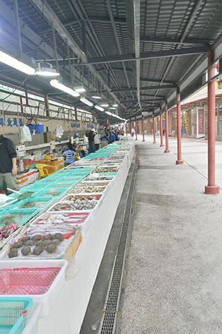 在海味中心的後面,是一棟S形的主體建築,長度有五百米,那便是灣仔海鮮街的酒樓,或者說餐廳吧。在酒樓的後邊,是一排鋼架結構琉璃瓦蓋頂仿木立柱的簡易棚,緊貼酒樓的走向,延伸近一裏路長。這樣的兩排建築,構成極具特色的灣仔海鮮街。食客先在棚裏購買海鮮,魚蝦蟹貝殼,繁多的品種,隨意選購,再委託酒樓(或餐廳)加工烹製,豐儉由人。