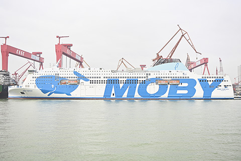 ◎ 四月十四日,廣東省廣州市,停靠在碼頭的「MOBY FANTASY」號輪。當日,由中國船舶集團廣船國際為意大利MOBY Line航運公司建造的二千五百客/三千八百米車道豪華客滾船「MOBY FANTASY」號輪在廣州南沙龍穴島啟航。該船是目前已建成的全球最大噸位的豪華客滾船,交付後將在地中海沿岸的意大利熱那亞、奧爾比亞以及里窩那之間的航線運營。(中新社記者 陳驥旻 攝)