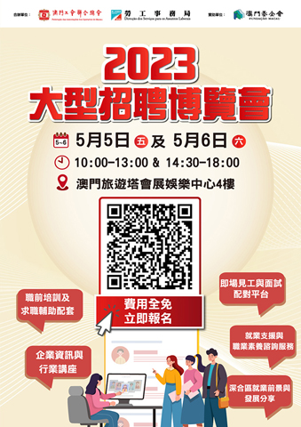 【特訊】為著力拓寬就業渠道,進一步促進居民就業,勞工事務局與澳門工會聯合總會於5月5日及6日假澳門旅遊塔會展娛樂中心4樓合辦「2023大型招聘博覽會」。有意參加者由即日起至4月28日進行網上預約(https://www.dsal.gov.mo/zh_tw/standard/spring_jobfair_workshop.html)。