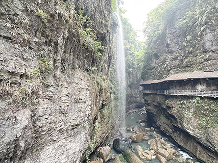 雲龍地縫被稱為「地球美麗的傷痕」,我們先去觀賞雲龍地縫,平面呈「之」字型,近南北向展布,全長3.6千米,平均深達75米,平均寬度15米。這裡河谷深邃,岸壁陡直,有「十里百丈絕壁」之稱,屬於主體觀光區域。雲龍地縫兩壁陡直,近於平行,上下寬窄基本一致,斷面呈「U」字形,非常罕見,在中國內地屬於稀缺性、獨特性。