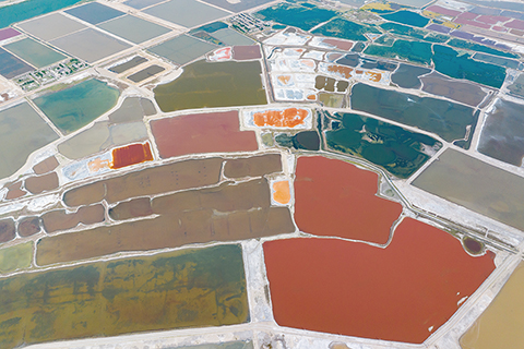 ◎ 五月十九日,山西運城,航拍鹽湖宛如七彩調色盤,色彩斑斕美不勝收。(無人機照片)(中新社記者 武俊傑 攝)
