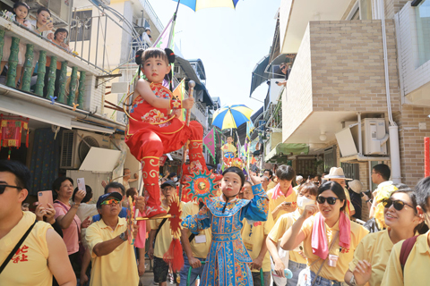 【香港中通社五月二十六日電】(香港中通社記者陳卓儀)艷陽高照的香港長洲島,遊客擠在不到兩米寬的路邊,鑼鼓聲中齊刷刷高舉手機,只為拍攝飄在半空中的小朋友。這是長洲太平清醮飄色巡遊的畫面。三年疫情停辦後,終於在五月二十六日佛誕日重新舉辦。