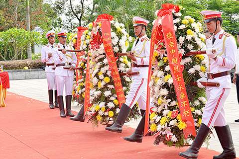 ◎ 六月六日,在老撾烏多姆賽省孟賽的中國烈士陵園修繕竣工,圖為儀仗隊向援老中國烈士敬獻花籃。(新華社)