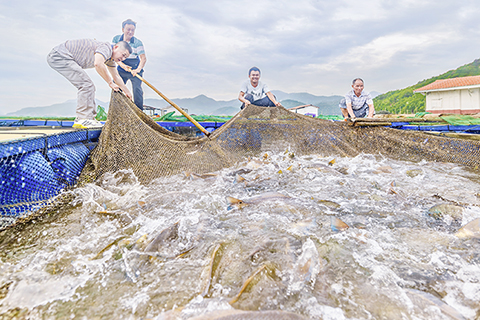 投喂飼料、查看海產品長勢……縱橫交錯的海上漁排上,「新漁民」劉成忠在自家一百多口網箱上忙碌著。二0一五年返鄉創業的劉成忠,一直跟著家裡人學習養殖技術,拓寬海產品銷售渠道,讓村裡的海產品走得更遠,「主要養殖鱸魚、紅鼓魚、海鯽魚等,銷售旺季時供不應求」。