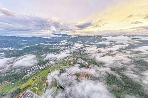 ◎ 六月二十九日傍晚,一場大雨過後,海南五指山雲霧繚繞,在夕陽的映襯下美不勝收。(無人機照片)(中新社記者 駱雲飛 攝)