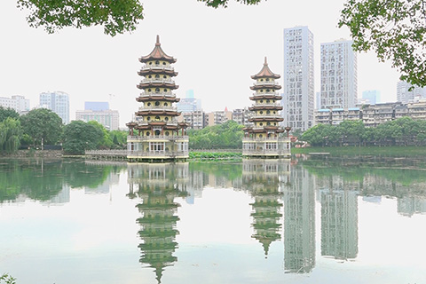 行走至位於台北路附近的寶島公園,張立綸忍不住當起了「導遊」:公園內有兩座塔是仿照高雄蓮池潭內「龍虎塔」而建,就連湖心島從空中俯瞰也形似縮小版的台灣島。據了解,隱匿於鬧市間的寶島公園,依湖而建,風景優美,周圍居民區林立,是當地民眾休閑健身的首選地。