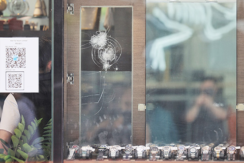【港訊】尖沙咀麼地道二十二號一間鐘錶行發生劫案,損失共八隻名錶,市值約三百八十萬元。警方正追捕五名年約三十至四十歲的男疑犯,指五人案發時身穿深色上衣和深色褲,其中一人持鐵鎚,一人持刀及鐵鎚。