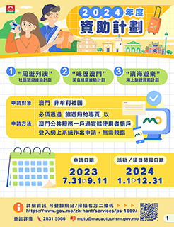 旅遊局期望在二0二三年的工作基礎上延續成效,繼續透過二0二四年度的「周遊列澳」、「味歷澳門」及「濱海遊樂」資助計劃的多樣化元素,吸引旅客入區玩樂消費,進一步刺激社區經濟。