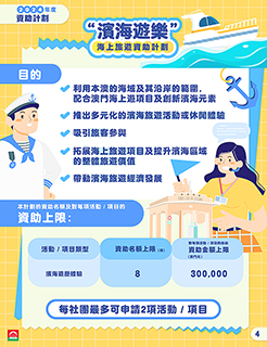 「濱海遊樂」海上旅遊資助計劃:利用澳門的海域及其沿岸的範圍,配合海上遊項目及創新濱海元素,推出多元化的旅遊活動或休閒體驗,吸引國際旅客參與,從而拓展海上旅遊項目及提升濱海區域的整體旅遊價值。