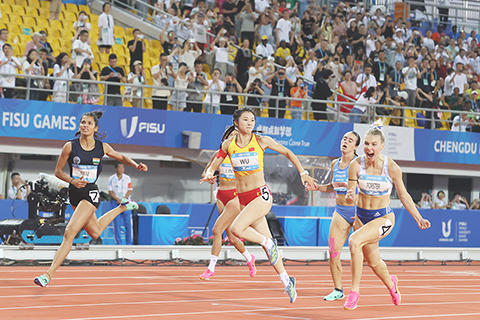 國家隊組合柳雅欣、井上北華、張雨霏和李冰潔,在女子4×200米自由泳接力賽,以7分58秒77,力壓美國隊和日本隊,奪得冠軍。其中,有「奧運蝶后」之稱的張雨霏,目前在今屆大運會已奪得5金牌。