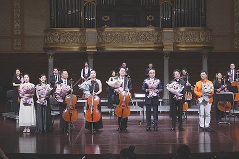 音樂會開始,大提琴齊鳴噴薄而出,《使命》如深海般咆哮的情緒撲面而來。隨後,富於變化、律韻如詩的《醉八仙》,感情真實、夢回童年的《蟲兒飛》,柔美婉轉、畫面感強的《秋之歌》,安寧靜謐的《摩爾普斯之歌》和《獻給大海》、《友誼天長地久》一首首曲目娓娓道來,將觀眾的思緒凝結在弓弦的起落動靜間,沉浸於演奏者所描繪的音樂世界裡。
