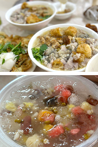麵線糊、海蠣煎、炸串都是正宗的閩南味道,麵線糊是閩台地區的一道風味小吃,呈糊狀,由細麵線、地瓜粉、海蠣、大腸、瘦肉、油條等製成,大腸鹵得入味Q彈。原公園後門四果湯,吃完麵線糊往前走就是那家四果湯,糖水很重要,冰糖白糖熬的,比工業糖漿味道好。甘蔗汁,我們喝了好幾家甘蔗汁,最喜歡一對老夫妻開的甘蔗汁店。