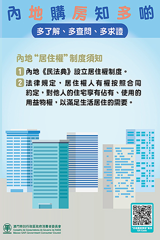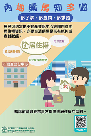 【特訊】隨著更多的澳門居民在內地置業,由於內地購房涉及兩地不同法律制度,消委會提醒有意在內地購房的居民,事前除了要查詢房屋查封和抵押情況外,還必須要了解清楚欲購買的房屋之前是否已經登記設立居住權,降低置業風險。