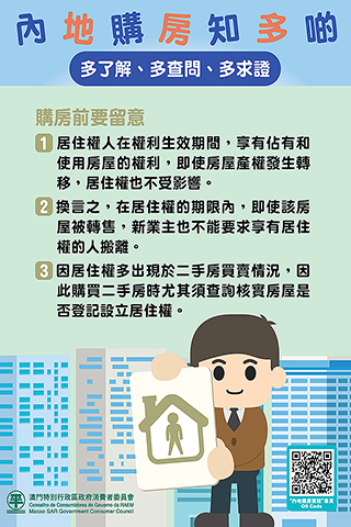消委會提醒居民在內地購房時,不僅要查詢房產權屬、司法查封、設立抵押等情況,還要查詢房屋是否登記有居住權。居民可到當地不動產登記中心等相關部門查詢有關資訊,購買前可以要求賣方提供無居住權的證明,如果欲購買的房屋設立了居住權,建議消費者在確認該房屋居住權註銷後再購買。