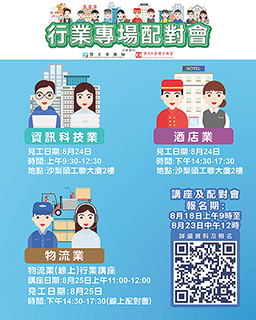本月25日下午舉辦物流業配對會,提供15個職位空缺,涉及運作主管、倉管員、快遞員及派送司機等。配對會以線上方式舉行。