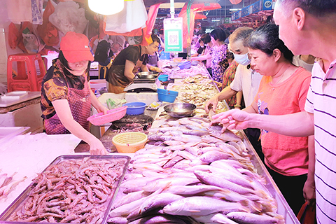 「『手快有,手慢冇』!今天野生『黃腳立』魚就這麼多,和『金鼓』魚同價,每公斤八十元。『豬公鰐』『銀米』『硬殼』這三樣小海魚同價,每公斤六十元。」八月十九日,台山台城街道富城市場一攤主招攬客人時介紹,該魚檔的海產是從台山深井鎮附近海域捕獲,每天八時前送達台城。