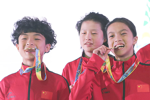 游泳池裡強手雲集,美國、英格蘭和東道主巴西隊實力都很強,中國隊敢於拼搏,獲得多塊獎牌。來自北京師範大學附屬實驗中學的趙梓喬獲得男子100米蛙泳冠軍,他還與隊友一起獲得男子4X100米混合泳接力銅牌,加上21日獲得的50米蛙泳銀牌,他已經集齊金銀銅獎牌。