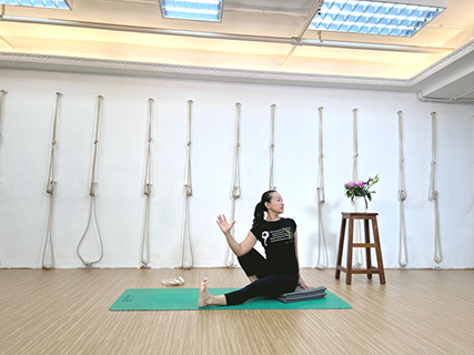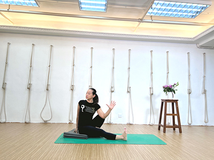 開始前,先在地上鋪上防滑墊。先坐在防滑墊上,然後屈曲右腳,左腳伸直;再屈曲左腳,右腳伸直。與此同時,將伸直的右腿的大腿膝蓋往上提,同時拓展胸腔,將脊柱不斷向上延展。隨著兩側軀幹的延展,特別是在舉高左手的時候,左邊的側軀幹也會加倍延展。