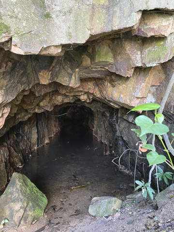 那天我們沿著家樂徑,很順利就找到神風洞。從洞穴的外觀、面積和形態,很明顯與早前發現的礦洞,有著很大的分別。神風洞口豎立了「不准進入」的告示牌,洞內嚴重積水,而洞頂也不斷有水滴下來,所以只能在外面觀察了。在神風洞口對開的左右兩邊,各豎立了一個牌匾,左邊的一個是介紹神風洞的歷史,而右邊的一個則是介紹南丫島的一種特有物種—廬文氏樹蛙。