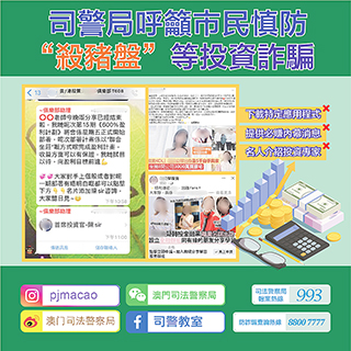 司警局呼籲市民,切勿輕信網上社交平台上所謂名人推介的投資廣告,更不要隨便加入來歷不明的可疑通訊軟件群組,尤其群組內之其他成員身份不詳,極有可能全部由騙徒假扮;同時,要慎防以小額獲利引誘投入大額資金的「殺豬盤」投資騙局,不要盲目跟隨任何聲稱高獲利、穩賺不賠的投資建議,以免因小失大而招致損失。倘懷疑遇到詐騙,請致電司警局防詐騙查詢熱線八八00七七七七或報案熱線九九三求助。◇