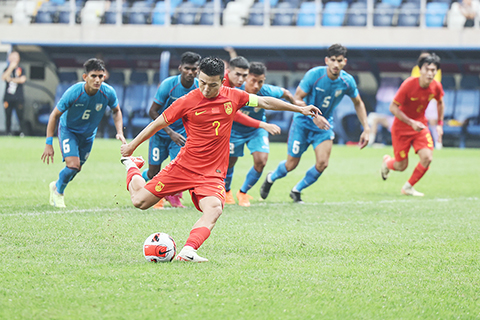 易邊再戰,中國隊展現了強烈的求勝意志和體能優勢,但賽況一波三折。第六十八分鐘,謝文能禁區內被犯規造點,陶強龍爆轟中路破門,將比分改寫為一比0。補時階段,第九十二分鐘,印度隊利用前場任意球攻門,門將蹇韜出擊脫手,胡荷韜解圍不當造成烏龍球,比分變為一比一。眼看勝局將要告吹,第九十五分鐘,替補登場的乃比江.莫合買提低射破門,中國隊完成驚險「絕殺」。