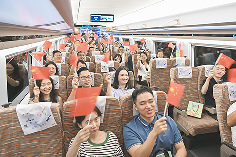 在首發列車的餐飲車廂,一場包含特色美食展示、茶飲品嚐、汕尾話童謠表演等環節的主題活動正在上演。潮式香滷雞腿、潮式香滷鴨翅、菠蘿咕嚕肉等具有沿途地區風味的餐食,以及甘草話梅、咸黃皮、牛肉脯等休閑食品琳琅滿目。針對汕尾人的品茶文化與喜好,車上還特別推出高鐵奶茶新品──東方水仙烏龍檸檬茶。旅客掃描列車座位扶手上的鐵路暢行碼即可點單,享受送餐到座服務。
