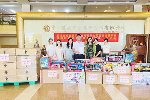 中山澳資企業駿成塑膠電子玩具有限公司董事長王清洗向澳門福建婦誼第一托兒所捐贈玩具儀式本月二十二日午假中山雅崗工業區駿成廠區內舉行。