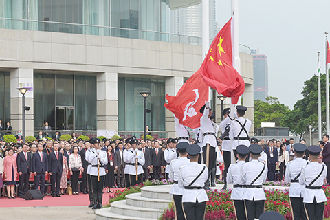 上午八時許,升旗儀式在金紫荊廣場舉行,全國政協副主席梁振英、香港特區行政長官李家超、中央駐港機構代表,以及香港特區終審法院首席法官、特區政府主要官員、立法會主席、行政會議成員等出席。