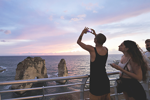 ◎ 圖為九月三十日,人們在黎巴嫩貝魯特著名景點鴿子岩觀賞日落並拍照。(新華社記者劉宗亞攝)