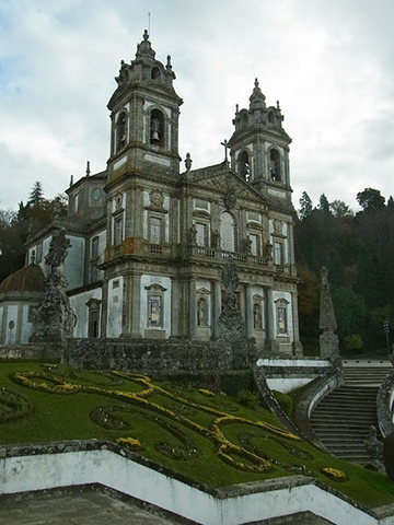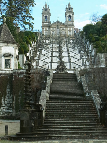 這就是世界獨一無二的宗教奇葩──巴洛克階梯,公元1722年興建,位於葡萄牙波爾圖近郊,超過一千級,共分十四層,照片所示乃最高六層,是昔日的信徒以手着地,屈膝跪拜,虔誠朝聖的艱苦天堂路,如今則設有登山纜車直達。