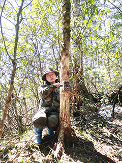 因此,做個合格的「撿屎官」要有強健的體魄。他們常常早上八點就背著乾糧和設備出發,在山裡一巡視就是八、九個小時。深山裡環境潮濕,地勢起伏,蛇蟲鼠蟻眾多,每年11月底到隔年3月底大雪封山,行路不便,而這些並不能消磨付明霞的熱情。