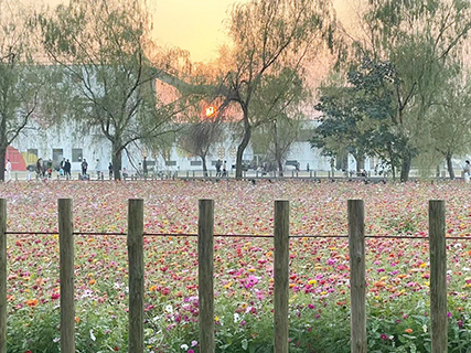 米文化研學基地的樓頂眺望,省界,曹安路。花橋鎮的一家村辦企業,先做桑塔納汽車,後來做停車場停放新汽車。安亭汽車城近在咫尺,廠裡技師退休後返聘手藝精良。國道交通檢查站,附近老百姓,身處交通便捷、資訊靈通的蘇滬交界,頭腦活絡,手腳勤快。以前這裡一年四季種蔬菜,除自己吃,多餘的農產品晨光熹微就送往上海各市場銷售,回家繼續參加集體勞動,還把上海日用品運來銷售。蘇滬經濟交流互通有無,口袋的錢都靠頭腦雙手實現富裕。