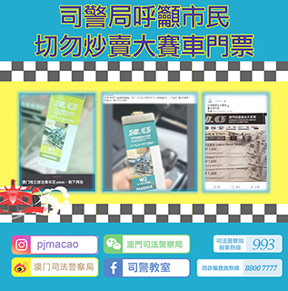 譚偉文稱完善輕軌發展策略研究的路線後 明年上半年展開公眾諮詢 善款累計逾一千七百萬元 百萬行四萬多人共襄善舉 文化區舉行第二場公眾意見收集會 與會者支持及認同規劃方向 岑浩輝今赴北京述職 黑沙青少年活動體驗營建設 周偉迎稱正按計劃推進 學子執筆記錄社區 傳承小城溫暖故事 「社區小記者培訓計劃」結業 琴澳志願服務合作 以i志願平台助青年扎根橫琴 文化局響應殘特奧會 將熱情與活力帶入社區 志總第十四屆志願者表彰禮舉行 嘉許逾五百人深化灣區志願服務合作 查獲眼藥水逾千四百盒 破「水客」活動散貨點 七人被查 工聯援助觸礁漁船漁民 逾百人出席 婦聯灣區全運會知識賽頒獎 粵華中學奪知識賽冠軍 澳電持續推進智能電網2.0建設 研更具韌性透明配電網發展 海峽兩岸暨港澳地區青年論壇舉行 冀搭建實質性對話平台 「社區健康促進人員培訓課程」舉行 二百一十四人結業並獲頒證書 衛生局參與世衛《國際衛生條例》水晶演練 築牢社會安全防線 「多元文化共融大使培訓計劃」結束 助青年成文化共融新力量 3+X全球順德青年交流活動 周明率廿餘名師生赴會 N城聯動秋季招聘活動 在湖南長沙舉辦 司警局進校園宣傳 預防性侵、傷人及欺凌 兩女子遭「公檢法」電話詐騙 共失逾九十八萬澳門元 識才職業技能比賽暨展才技能競賽頒獎 五十六特殊人士與八義工獲獎 羅奕龍表示擬明年以宋玉生廣場一帶試點街道禁煙 會諮詢公眾以檢視試點成效 司警局呼籲市民 切勿炒賣大賽車門票 2023-11-17 03:30:00 【特訊】近日,司法警察局發現有人於網上社交平台炒賣第七十屆澳門格蘭披治大賽車定價門票、大會贈券以及特許通行證。 司警局提醒市民,切勿炒賣定價門票或官方送贈的門票,有關行為可能會觸犯刑事法律。同時,市民應向活動的主辦方或獲其授權的銷售方購買門票,避免助長炒賣風氣。市民如遇到懷疑網絡詐騙或其他犯罪時,應立即致電司警局防詐騙查詢熱線八八00七七七七或報案熱線九九三求助。◇
