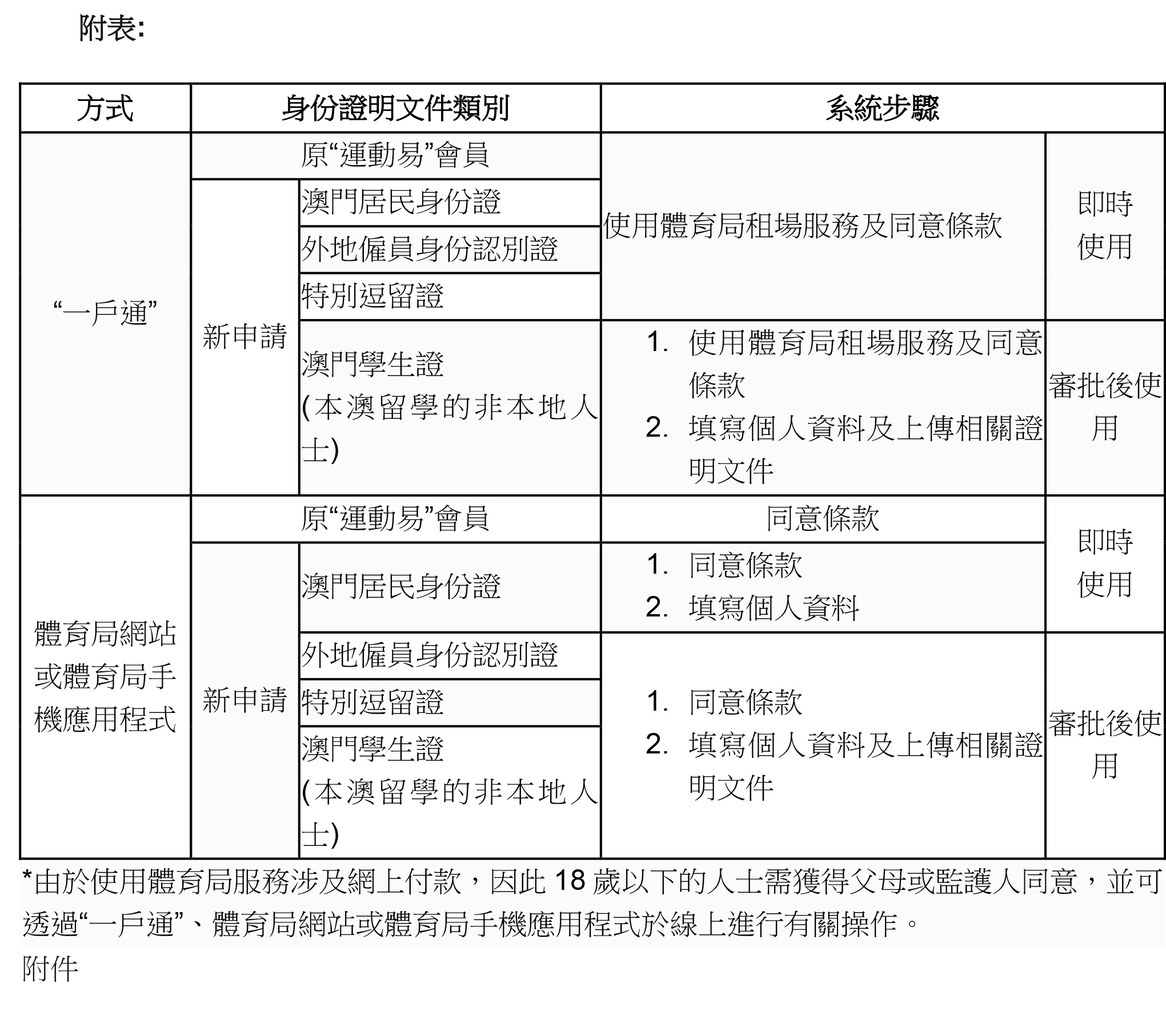 於2023年11月22日起,居民於現場預約體育設施門票時,須出示本人已於體育局服務系統登記的身份證明文件(正本/副本/電子身份),包括澳門居民身份證、外地僱員身份認別證、特別逗留證或澳門學生證(只適用於在本澳留學的非本地人士)。而在取用體設施時,居民除須攜同門票(實體或電子版)外,亦須出示門票上登記的身份證明文件(正本/副本/電子身份),以便現場工作人員作出核對。