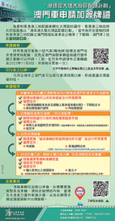 又:粵港澳三地政府延續「港珠澳大橋大灣區配額計劃」,持有粵港澳三地配額車輛除原有口岸配額外,可申請加簽深圳灣口岸和橫琴口岸,即獲加簽後之澳籍車輛可經深圳灣口岸通關,而港籍車輛則可經橫琴口岸通關。