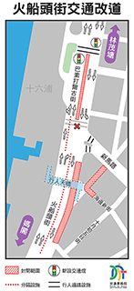 內港南雨水泵站箱涵渠及下水道工程即將進入最嚴峻的施工階段,即靠近新馬路及十六浦的路段將會開挖,配合施工需要,於十二月二日(周六)起,介乎十月初五日巷與新馬路之間的一段火船頭街實施有限度通車,屆時往媽閣方向部份路段只可單線行車,同時會再次臨時停用「粵通碼頭」巴士站,交通事務局將在河邊新街近陳樂巷、安仿西街的路段設置臨時巴士站供乘客使用,詳情可參閱兩巴網頁(http://www.tcm.com.mo及http://www.transmac.com.mo)。
