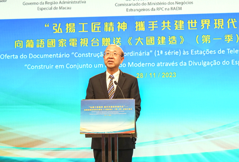 劉顯法特派員在致辭中表示,為落實習近平主席關於高品質共建「一帶一路」等重要指示精神,公署選取《大國建造》紀錄片並委託澳廣視譯成葡文,旨在同葡語國家觀眾分享中國新地標專案的建造過程和建設經驗。這些重大工程是中國高速發展、高品質發展的縮影,是對中國以人民為中心發展理念的詮釋,也為推進中國與葡語國家合作奠定了堅實的技術、物質和精神基礎。公署將繼續支持澳門更好發揮中葡平台作用,為中國與葡語國家合作增添新機遇、提供正能量。希望中葡媒體界人士繼續講好中葡友好合作、包容互鑒的生動故事,為推動構建人類命運共同體、助力實現世界現代化貢獻更多智慧和力量。