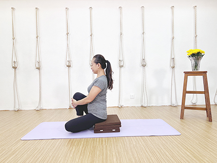 注意:此練習不應在進食後進行。此坐跪式體式可以適當地調整輔具的高度,進行時坐姿必須穩定,亦可以使用伸展帶或毛巾作為輔具。