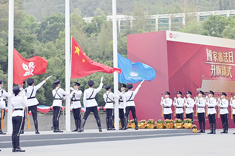 升旗儀式在入境事務處樂隊演奏的《東風浩蕩進行曲》和《鋼鐵洪流進行曲》中落下帷幕。香港特區政府保安局局長鄧炳強、各紀律部隊負責人等出席儀式。