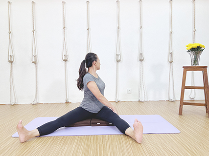 接著雙腿向左右兩邊張開,注意雙腿大腿下方的肌肉要緊貼地面。然後將左手置於左大腿外,並將腰部同步轉腰。之後保持坐直,腰部轉向身體一則,以鼻子自然呼吸,然後返回至正前方,再保持坐直。接著再將身體轉向另一側,保持腰背和脊椎挺直,擴展肋腔,保持自然深長呼吸。