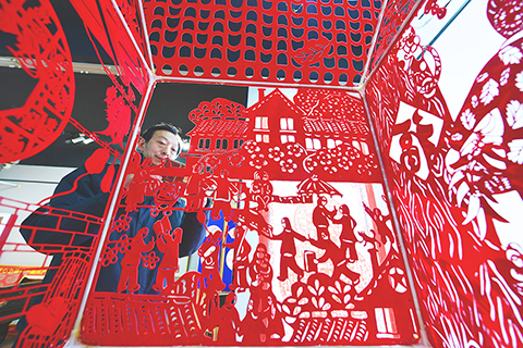 ◎ 十二月二十八日,河北省衡水市阜城縣一家剪紙工作室,參觀者觀看剪紙作品《老家》。據了解,阜城剪紙至今已有二百多年歷史,二0一六年被列入河北省省級非物質文化遺產名錄。該技藝具有陰陽相間、線條流暢、色彩單純、形象鮮明、刀工巧妙等藝術風格,它以傳統的中國繪畫為基礎,材料有絲綢、布匹、絹紙、宣紙等。如今,阜城剪紙作品不僅暢銷北京、天津、東北三省,還遠銷新加坡、韓國等二十八個國家和地區。(中新社記者 翟羽佳 攝)