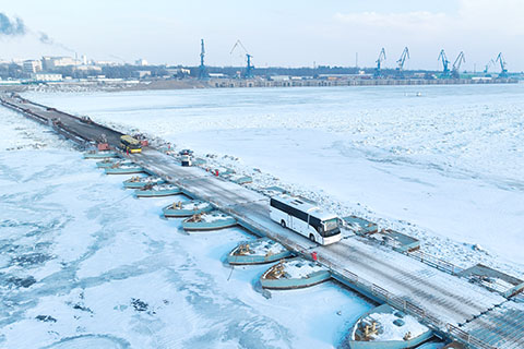 中國黑河與俄羅斯遠東地區第三大城市布拉戈維申斯克市隔江相望,被譽為「中俄雙子城」。浮箱固冰通道運輸是中俄界江冬季運輸的主要形式,填補了黑龍江在流冰期前後兩個多月時間無法通關的運輸空白期,在實現黑河口岸四季通關中發揮著重要作用。