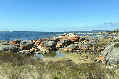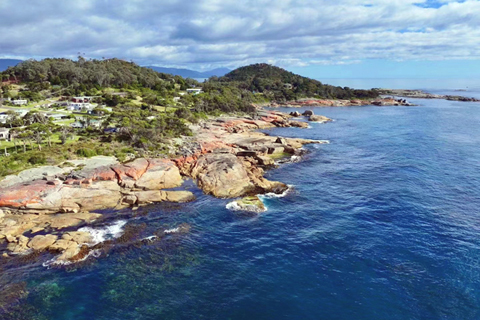翌天早上,我們先到靠近比舍諾的噴水洞遊覽,在一片礁石中,由於海浪衝擊礁石中的岩洞,海水從礁石的頂部孔縫朝空中噴湧而出,由於海浪大小不一樣,衝擊力也不一樣,從孔縫中噴湧而出的水柱大小不一。噴水洞周圍的礁石有大小顏色不一的橙紅色色塊,這是由於一種地衣附著在花崗岩上形成的特殊地貌。橙紅色的岩石,白色的沙灘,湛藍的海水,加上天氣好,藍天白雲綠草,簡直就是一幅澳洲水墨畫。陽光照耀的海濱,從礁石上航拍橙紅色的岩石就很好看,空中俯瞰很大氣。