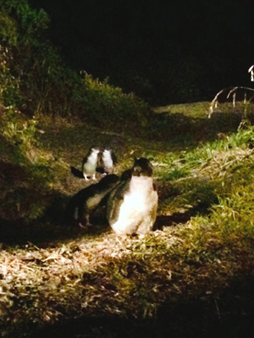 夜幕降臨,我們住宿在塔斯馬尼亞島東南部的比舍諾小鎮,這是個臨海的度假小鎮。我聽說20:30至21:30時,企鵝會游上沙灘歸巢,我們吃完晚飯就到海濱尋找,到21:00左右真的看到企鵝來個親密接觸,這是我人生第一次近距離在野外偶遇企鵝!