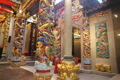 「興潮天后宮主殿屋頂由兩層構成,金鑾殿內建有十四條盤龍柱,這在傳統建築中比較少見。」藍木耀說,重新修繕的興潮天后宮按照潮汕古建築設計佈局,邀請潮汕地區的能工巧匠進行施工,整座建築集石雕、木雕、瓷嵌、壁繪、灰塑、貼金之大成,工藝繁複細膩,兼具藝術性和觀賞性。